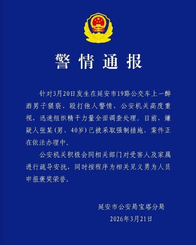 针对3月20日发生在延安市19路公交车上一醉酒男子猥亵、殴打他人警情,公安机关高度重视,迅速组织精干力量全面调查处理。目前,嫌疑人张某(男,40岁)已被采取强制措施,案件正在依法办理中。公安机关积极会同相关部门对受害人及家属进行疏导安抚,同时按程序为相关见义勇为人员申报褒奖荣誉。