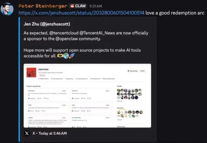 Peter发了一条推文,确认腾讯轻量云已通过GitHub Sponsors正式成为OpenClaw社区赞助商。