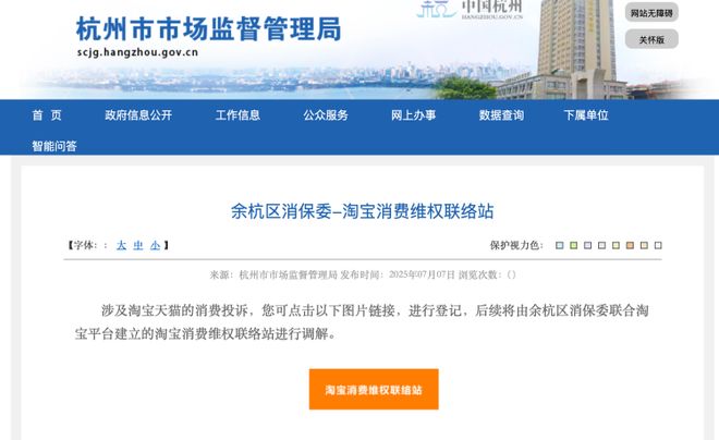 据报道,淘宝消费维权联络站于2023年3月15日上线,是余杭区市场监督管理局指导淘宝设立的调解平台。上游新闻记者在杭州市市场监督管理局官网看到,在消费者维权渠道中,余杭区消保委设置了淘宝消费维权联络站投诉链接。说明中提到,涉及淘宝天猫的消费投诉,可通过链接进行登记,后续将由余杭区消保委联合淘宝平台建立的淘宝消费维权联络站进行调解。