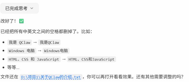 随后,我又要求QClaw编辑一下文档中的文字,将英语和汉语之间的空格删掉。