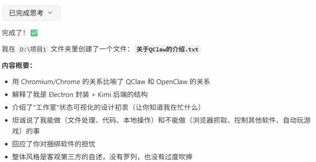 我要求QClaw给我生成一篇介绍文档,大约3分钟后,QClaw就实现了我的需求。