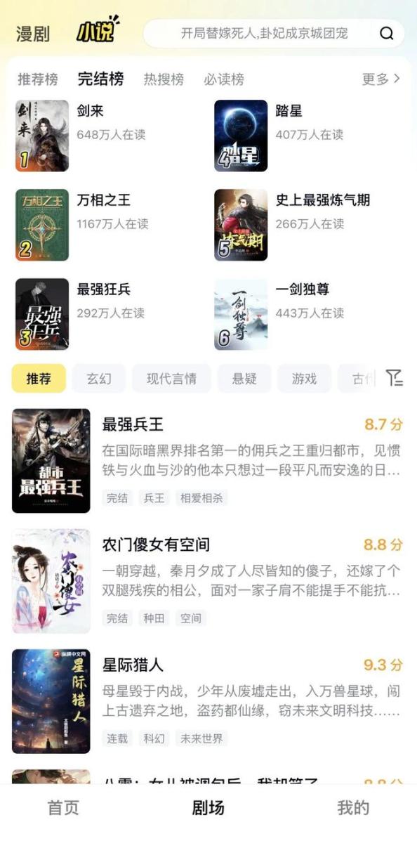 另一边,柚漫剧在产品上就显得完备得多。除了缺少红果式福利页以外,它的框架和红果漫剧大体一致,并像红果集成番茄那样接入了包括纵横中文网在内的百度系小说资源,比如《剑来》《踏星》等等。