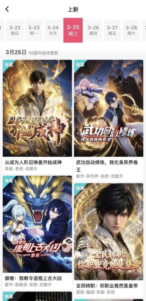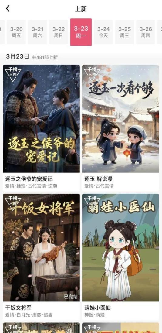 此外,格外值得一提的是,在找片页面,火龙漫剧还上线了一个与排行榜并列的“上新”入口。点击之后,用户能看到一段时间内的漫剧上新情况,比如过去一周,火龙漫剧基本上每天都会上线400部以上的新漫剧。
