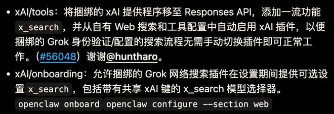 xAI/引导流程:内置 Grok 网页搜索插件现可在openclaw onboard及openclaw configure --section web期间提供可选的x_search配置,包含使用共享 xAI 密钥的x_search模型选择器。