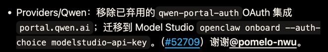 提供商/通义千问:移除已废弃的 qwen-portal-auth OAuth 集成(用于 portal.qwen.ai),迁移至 Model Studio,可通过openclaw onboard --auth-choice modelstudio-api-key完成接入。