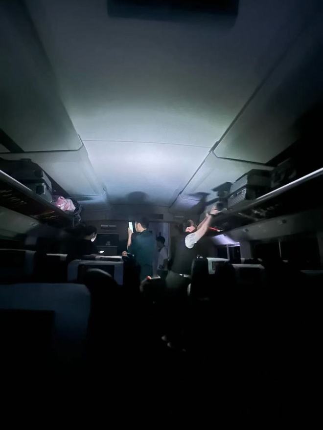 乘客提供的多张照片显示,因停电,车厢内一片漆黑,有乘客利用手机照明,查看自己的行李。