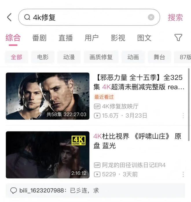 时至今日,在B站搜索“4K修复”,依然可以看到诸如《猎魔人》《破产姐妹》《沙拉的真伪人生》等海外影视的搬运内容,很多如《火影忍者》《生化危机》这样的经典作品,视频播放量已经超过了2万。