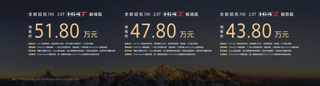 3月31日消息,全新坦克700日前正式开启预售。新车推出3.0T Hi4-T、2.0T Hi4-Z两大动力版本共3款车型,官方预售价43.80万-51.80万元。