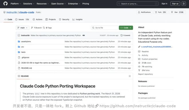 有网友直接爆粗:「见鬼了。」另一位开发者 @realsigridjin动作更快,已经把泄露的源码备份到了 GitHub,仓库名叫 instructkr/claude-code,标注为「Claude Code Snapshot for Research」。