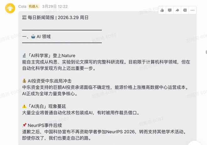 它知道我最近在关注什么话题。它不是机械地搜“今日AI新闻”,而是把我关心的方向自动整合进简报,然后推到我的飞书群。在我和它讨论过NeurIPS事件后,它自动帮我在早报里加上了该事件的后续。