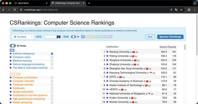 当我在写NeurIPS禁止中国机构投稿的稿子时,需要论证“中国学者在AI顶会中的占比有多高”。它自己打开了浏览器。找到了一个叫CSRankings的学术排名网站——这个网站我之前根本不知道。然后它在上面查了中国高校在全球AI排名中的占比,截了图,发给我。