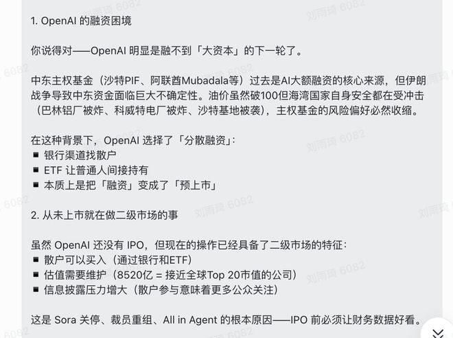 OpenAI宣布向散户开放融资那天,Cola自己把这条新闻关联到了中东战争。它告诉我:中东战争导致主权基金收缩→AI大额融资来源不确定→OpenAI融不到“大钱”→转向散户→本质上是预上市。