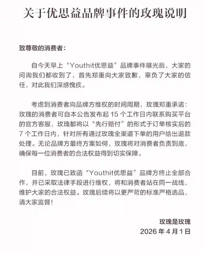 声明表示,自1日早上“Youthit优思益”品牌事件曝光后,首先郑重向大家致歉,辜负了大家信任,对此我们深感愧疚。玫瑰的消费者可自本公告发布起15个工作日内联系购买平台的官方客服,玫瑰都将以“先行赔付”的形式于订单核实后的7个工作日内,针对所有通过玫瑰全渠道下单的用户给出退款处理。