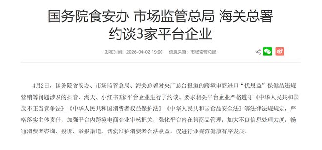 市场监管总局网站消息,4月2日,国务院食安办、市场监管总局、海关总署对央广总台报道的跨境电商进口“优思益”保健品违规营销等问题涉及的抖音、淘天、小红书3家平台企业进行了约谈。要求相关平台企业严格遵守《中华人民共和国反不正当竞争法》《中华人民共和国消费者权益保护法》《中华人民共和国食品安全法》等法律法规规定,严格落实主体责任,加强平台内跨境电商企业审核把关,强化平台内在售商品管理,加大不良信息处理力度,畅通消费者咨询、投诉、举报渠道,切实维护消费者合法权益,促进行业规范健康有序发展。
