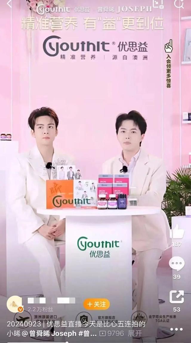 记者注意到,李若彤、明道、章小蕙等直播间曾推广优思益产品,而演员曾舜晞2024年曾为优思益普通食品代言,更在当年6月、9月,数次出席了该产品的直播活动。