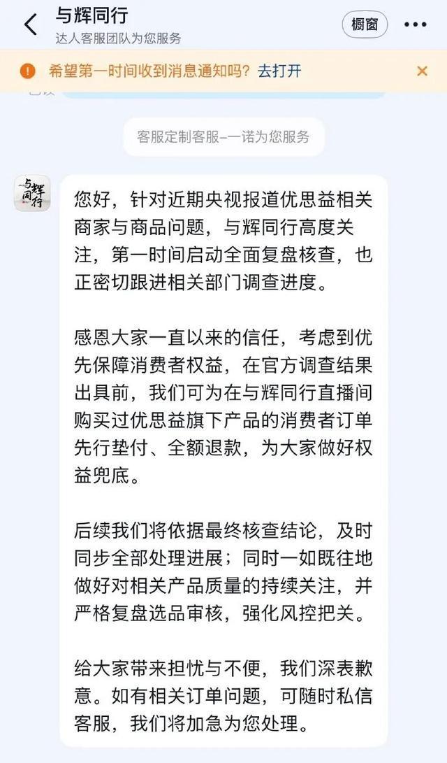 感恩大家一直以来的信任,考虑到优先保障消费者权益,在官方调查结果出具前,我们可为在与辉同行直播间购买过优思益旗下产品的消费者订单先行垫付、全额退款,为大家做好权益兜底。