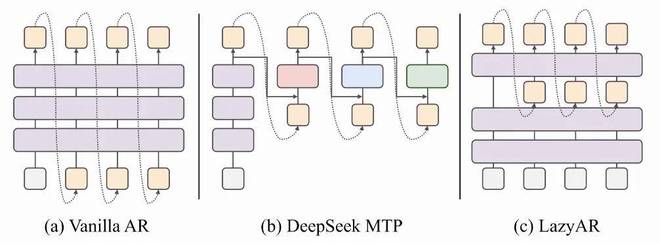LazyAR 的核心操作: 将对上一步 token 的依赖 "延迟" 到中间某一层(第 K 层)注入:
