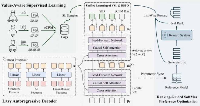 广告推荐的优化目标不是 "猜中用户会点哪个" 那么简单,而是要在eCPM 排序、NDCG 等列表级指标下最大化商业价值。现有的生成式推荐方法大多沿用 LLM 的分阶段训练方式,不完全适配大规模推荐场景的持续在线学习,且缺乏面向排序的、列表级的学习设计。