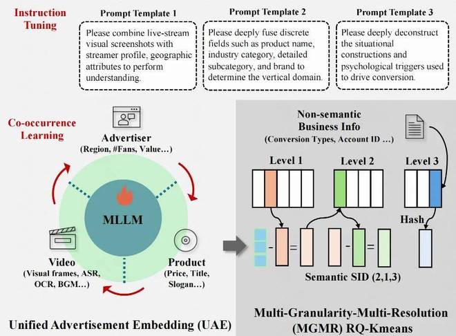 核心思想:用一个端到端微调的多模态大模型(MLLM)为每条广告生成统一嵌入,再通过精心设计的量化方法将其编码为离散 Semantic ID。