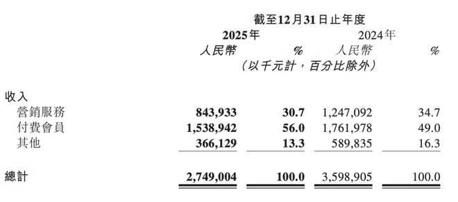 与之形成对比的是,营销服务收入占比从2021年的62.3%降至2025年的30.7%。第四季度,营销服务收入占比降至36.5%。