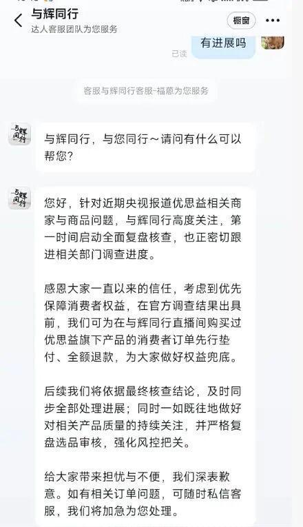 记者第三次询问时,工作人员表示,“考虑到优先保障消费者权益,在官方调查结果出具前,可为在与辉同行直播间购买过优思益旗下产品的消费者订单先行垫付、全额退款,为大家做好权益兜底。”
