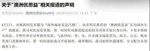 4月1日晚间,澳洲优思益Youthit发布官方声明表示,报道中提及的澳大利亚墨尔本地址,为品牌方自有物业,已停止使用,目前正办理新办公地址注册更新;被提到的“广州公司”广州雅拉源健康科技有限公司仅为品牌授权运营方;产品分别安排在澳大利亚、新西兰的合规工厂,以及此前阶段性合作的国内合规工厂完成。并承认优思益第一代铁饮产品,系授权国内营养品上市企业工厂生产。
