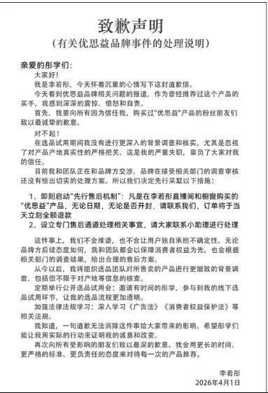 李若彤发布致歉声明表示,“感到深深的震惊、愤怒和自责”“在选品试用期间我没有进行更深入的背景调查和核实。尤其是忽视了对产品产地真实性的严格把关。这是我的严重失职,辜负了大家对我的信任。”并即刻启动“先行售后机制”:“凡是在李若彤直播间和橱窗购买的“优思益”产品,无论日期,无论是否开封,请联系我们,订单将于当天立刻全额退款。”