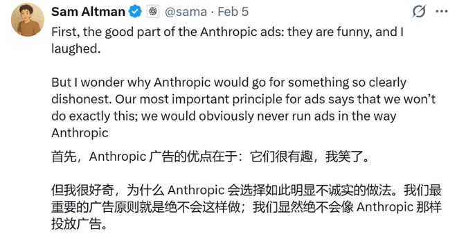 今年2月初,Claude开发商Anthropic曾借超级碗广告抨击OpenAI在ChatGPT中测试广告的做法,阿尔特曼称该广告“有趣”但具有误导性。