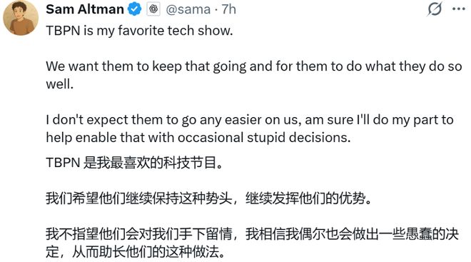 今天,OpenAI联合创始人及首席执行官萨姆・阿尔特曼(Sam Altman)在X平台发文称:“我并不指望TBPN会对我们手下留情,而且我肯定会时不时做出些愚蠢的决定,给他们提供素材。”