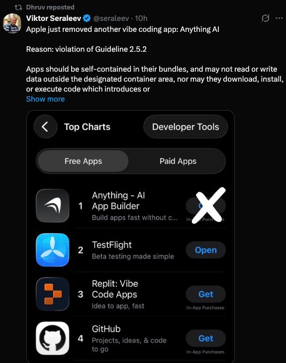 事情在两周后愈演愈烈。一款名为Anything的vibe coding应用被苹果直接从App Store下架。这款产品去年9月刚拿到1100万美元融资,估值1亿美元,用户通过它已经发布了数千个App Store应用。Anything的开发者已经主动提交了合规更新,把应用预览改成在浏览器里打开,试图满足2.5.2的要求,但苹果拒绝了这个更新,随后将应用整个下架。
