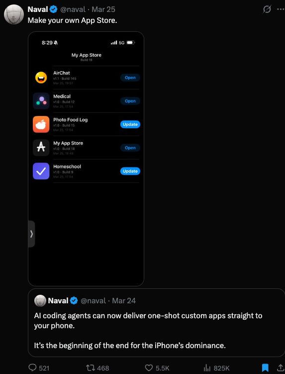 硅谷知名投资人Naval Ravikant几天前在X上晒出了自己用AI做的一屏应用,配文只有一句话,“打造你自己的App Store(Make your own App Store)。”他在另一条帖子里写得更尖锐,“AI编程代理现在可以一步到位把定制应用送到你的手机上,这是iPhone统治地位终结的开始。”