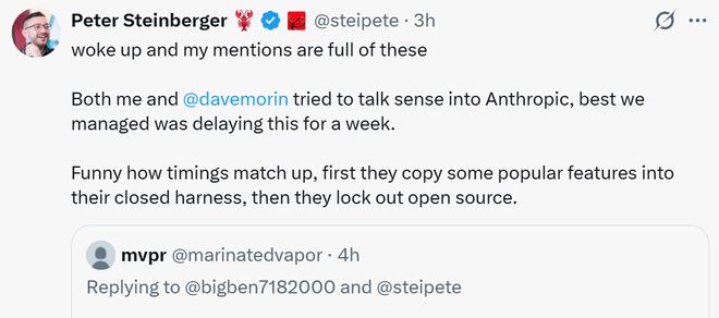 针对这一封锁事件,Peter Steinberger在X上回应,他和Dave Morin(OpenClaw基金会的董事会成员)已经尽力去说服Anthropic,但最终只把将这件事推迟了一周。