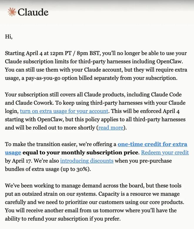 Claude官方发送的邮件还提到,这项政策从4月4日起先在OpenClaw上强制执行,但适用于所有第三方工具链,并将很快推广至更多工具。