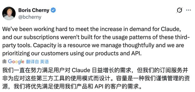 他提到,Anthropic一直在努力应对Claude需求的增长,而其订阅服务,本来就不是为第三方工具的使用模式设计的。算力是需要审慎管理的资源,Anthropic要优先保障使用自家产品和API的客户。