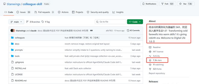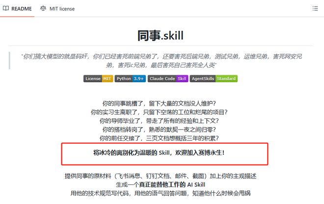 这个上线五天收获7.3千星标并快速出圈的开源项目“同事.skill”,是一款基于Claude Code的AI Agent工具,可以收集离职员工的聊天记录、文档、代码等数据(如飞书消息、钉钉文档、邮件、截图),加上一些主观描述,喂给大模型,便能生成一个能模仿该员工工作习惯、说话方式的AI分身,一个能接替该员工继续工作的数字人。