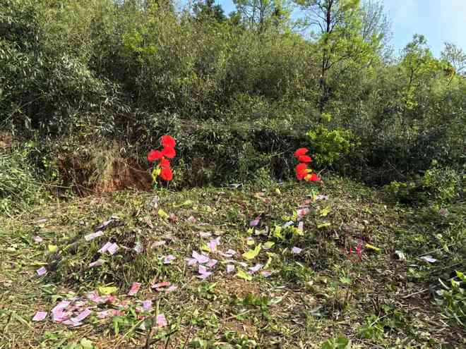 9点多,到达第一个墓地。大家献上祭品,将纸钱撒在周边,磕头祭拜,随即赶往下个地点。曹贵宾说,多年前清明扫墓村民会烧纸钱,但近年来大家文明祭扫、加强森林防火的意识逐步加强,基本不再烧了,撒在坟上就行。