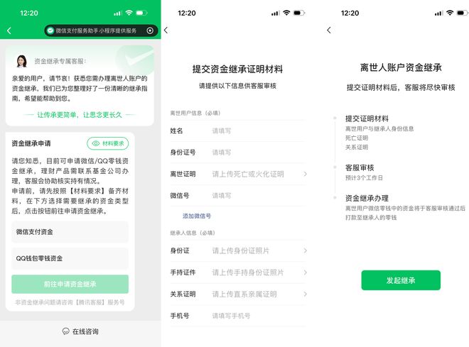 材料完备的情况下,逝者零钱资金一般一到三个工作日、最快24小时可完成提取。办理路径很简单:继承人用自己的实名微信号,点击【我】→【服务】→【钱包】→【客服中心】,输入“微信支付财产继承”,就能进入专属客服专区,按指引提交申请。