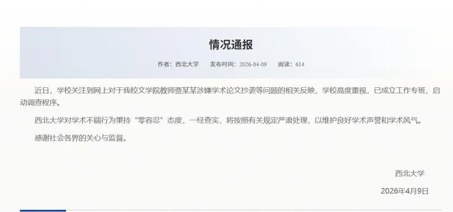 今晨,西北大学发布情况通报表示,近日学校关注到网上对于该校文学院教师贾某某涉嫌学术论文抄袭等问题的相关反映,学校高度重视,已成立工作专班,启动调查程序。