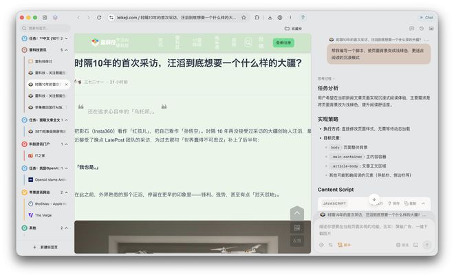 但其实这个设计我认为还是蛮巧妙的,Tabbit 本来就不是一个传统意义上的“浏览器”,它的核心是帮用户干活。既然如此,它的确不应该把“浏览”的需求放在最显眼的地方,反倒是一个对话框,你直接指使它干活就好了。