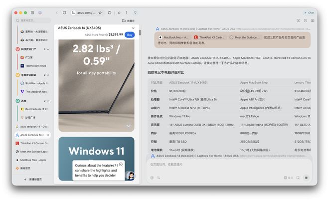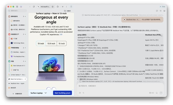 我们每天打开浏览器,其实干的活都差不多,无非都是找找资料、浏览一下信息,但作为一位编辑,在撰写文章时需要查的资料还真不少,打开十几个网页算是比较常规的操作了。比如想要对比 MacBook Neo 和 Surface Laptop 7 这两款产品的参数,正常来说需要来回两个页面切换对比,或者双开窗口,左右滑动对比。