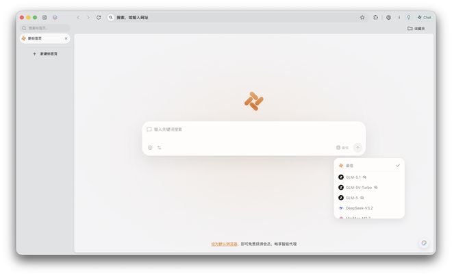 更大的变化在于“新建页面”这件事。在大多数浏览器里,新开一个标签页,看到的通常是搜索框、书签,或者一堆推荐内容。但在 Tabbit 里,打开新页面,直接就是一个对话框。这其实会让我感觉到有点疑惑,这还是个浏览器吗?