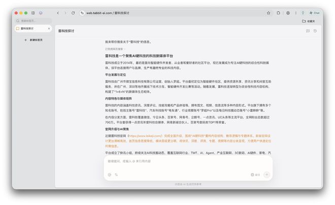为了看看 Tabbit 和传统意义上的浏览器,或者最近流行的 AI 浏览器们有什么不同,我决定把 Tabbit 当作主力浏览器用一段时间,以下是雷科技的使用体验报告。