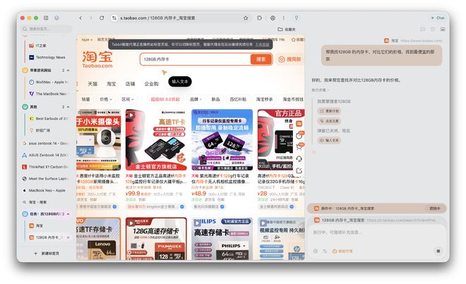 马上不是 618 要来了吗?我也尝试了一下让 Tabbit 去购物平台进行比价,选了个“128GB 内存卡”产品,让它找价格最低的那款,不一会它就找到了。这给我的感觉就像是一个真正的助理,网页涉及到的琐碎事都可以丢给它干。