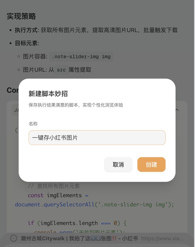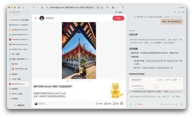 我还想到一些不算太“道德”的事情,部分社交平台是没有提供直接保存图片功能的,于是我尝试让 Tabbit 去写一个JavaScript 脚本,让我能保存这些图片,没想到也是顺利进行了,而且图片质量还比复制的要好得多。