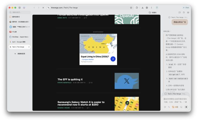 比如我随便打开一个信息流网站,本来页面上有不少干扰内容,广告、推荐位、各种跳转入口都混在一起。以前要么忍着,要么去装插件,现在我直接跟它说了一句“屏蔽所有广告”它立刻就开始写一个JavaScript 脚本,然后执行起来,把广告全部屏蔽掉。