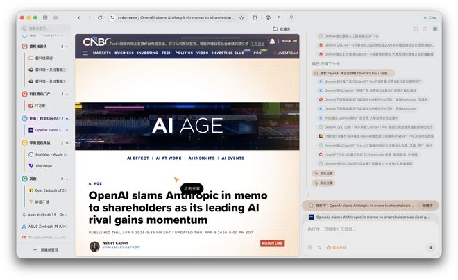 当然,如果你甚至不想要自己动手去做事,也可以直接让Tabbit 帮你干。只要在“Chat”模式里找到“智能代理”,输入你想要让它做的事情,它就会自动在此页面里完成一系列的操作。例如,我让它在某资讯网页里找到 OpenAI 相关的话题,并找到十个可以深度挖掘的角度,它立刻就开始操作,整个过程我们也可以离开此页面,它会自动完成所有步骤。