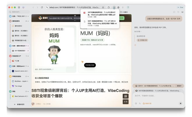 Tabbit 结合了两者的优势,同样是 AI 浏览器,它保留的功能都是用户的痛点需求,而那些不那么常用的,Tabbit 选择留给大模型“手搓”。就像 Tabbit 不会直接给你一个 PDF 文件生成器,但你提了需求,它就会写一个脚本来满足你。