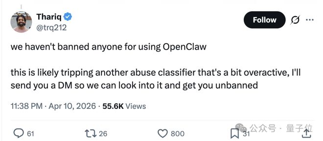 我们没有因为使用OpenClaw而封禁任何人。这很可能是触发了另一个有点“过于敏感”的滥用检测分类器,我们会帮你解封。