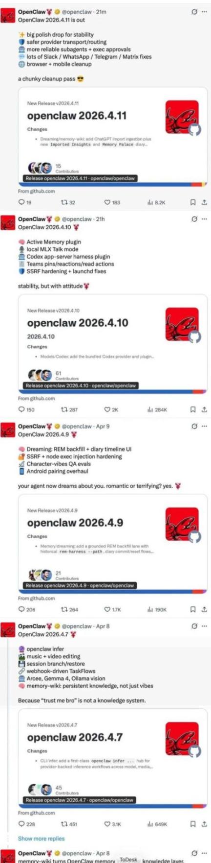 五天,五个版本号 —— 从 v2026.4.7 到 v2026.4.11,开源个人 AI 助手 OpenClaw(龙虾)在 GitHub 上完成了一轮堪称「火力全开」的密集迭代。