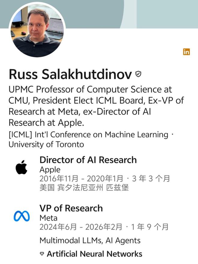 此外,Meta生成式AI研究副总裁Russ Salakhutdinov也已离职。在加入Meta前,他曾担任苹果AI研究总监。